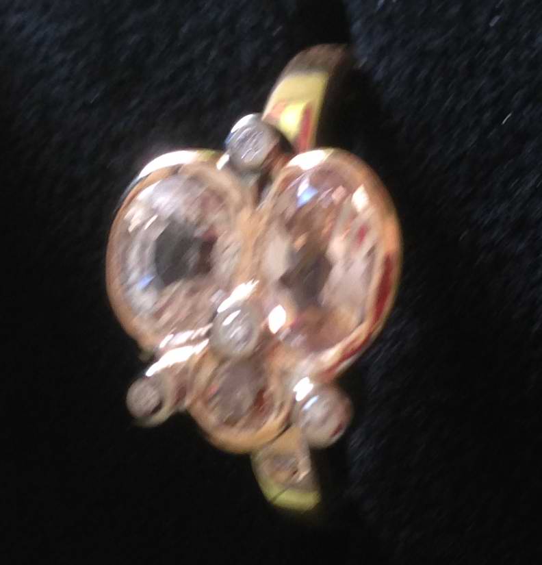Först har vi en bild på väldigt unik guldring (bör vara den ända med sådan kombination) med ädelstenarna, Morganit, Fenakit och Champange Diamant.